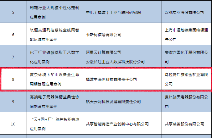 福建中KY.COM科技《复杂环境下矿山设备全生命周期管理》项目成功入选工信部2019年工业互联网平台创新应用案例。