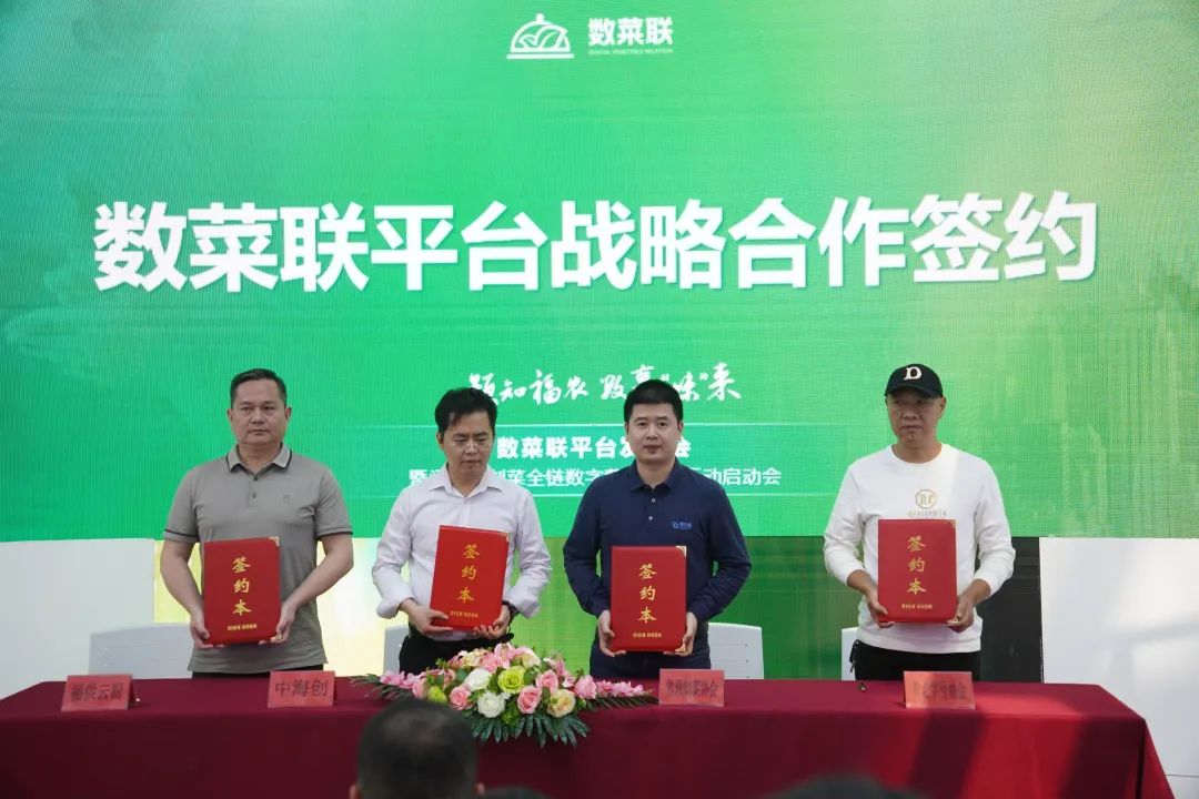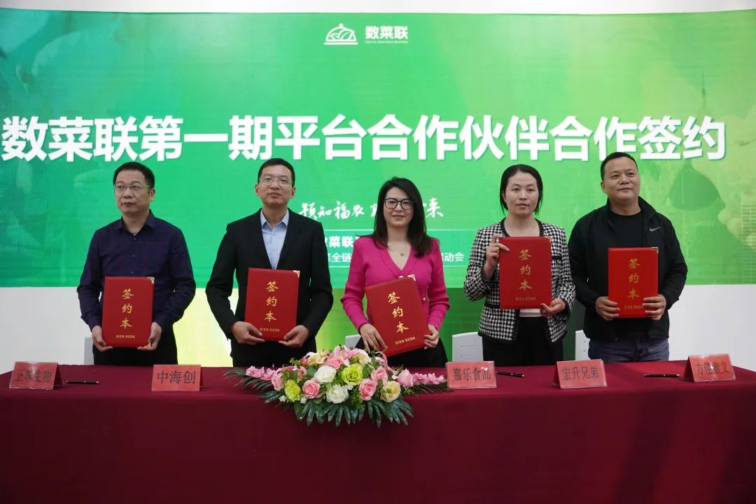 随后,天马食品、东水食品、泽霖食品、味太太食品、嘉乐食品、宏升兄弟、方便煮义、正味生物、金麦园食品、乐鸿国际、醉悦臣生物、大润优餐饮,共12家企业代表上台,作为数菜联第一期平台合作伙伴进行签约。